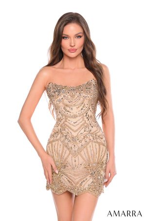 This dress is a strapless, figure-hugging cocktail stunner with a fancy design. The bodice dazzles with sparkling sequins and beads, forming a mesmerizing geometric masterpiece. The embellishments continue down the dress, forming a chevron that accentuates the figure. The overall silhouette is sleek and glamorous, perfect for a formal or evening occasion.
