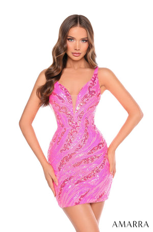 This dress has a low V-neckline that looks elegant and sexy. Its form-fitting bodice contours the curves delicately, while the bodycon mini length, grazing mid-thigh, promises a captivatingly short yet elegant style. A striking feature lies in the intricate sequin patterned embellishment adorning the entirety of the garment, swirling in an abstract motif, lending texture and visual intrigue. Supported by delicate spaghetti shoulder straps, this ensemble captures attention with its fusion of a well-fitted fit, daring neckline, and vibrant design, crafting a mesmerizingly glamorous party attire.