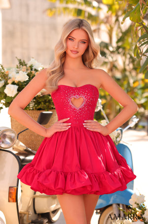 This playful mini dress features a sweetheart neckline with a heart-shaped cutout and sparkling rhinestones. A voluminous skirt with a ruffled hem adds movement and flair. Perfect for date nights or flirty parties.