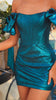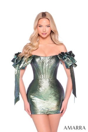 This off-the-shoulder mini dress features a shimmering metallic fabric and dramatic bow sleeves. The corset bodice cinches the waist for a flattering fit. Eye-catching and bold for any special night.