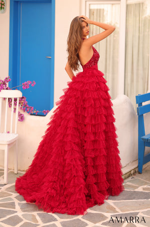 Ruffle Tulle Ball Gown With Beaded Halter Top