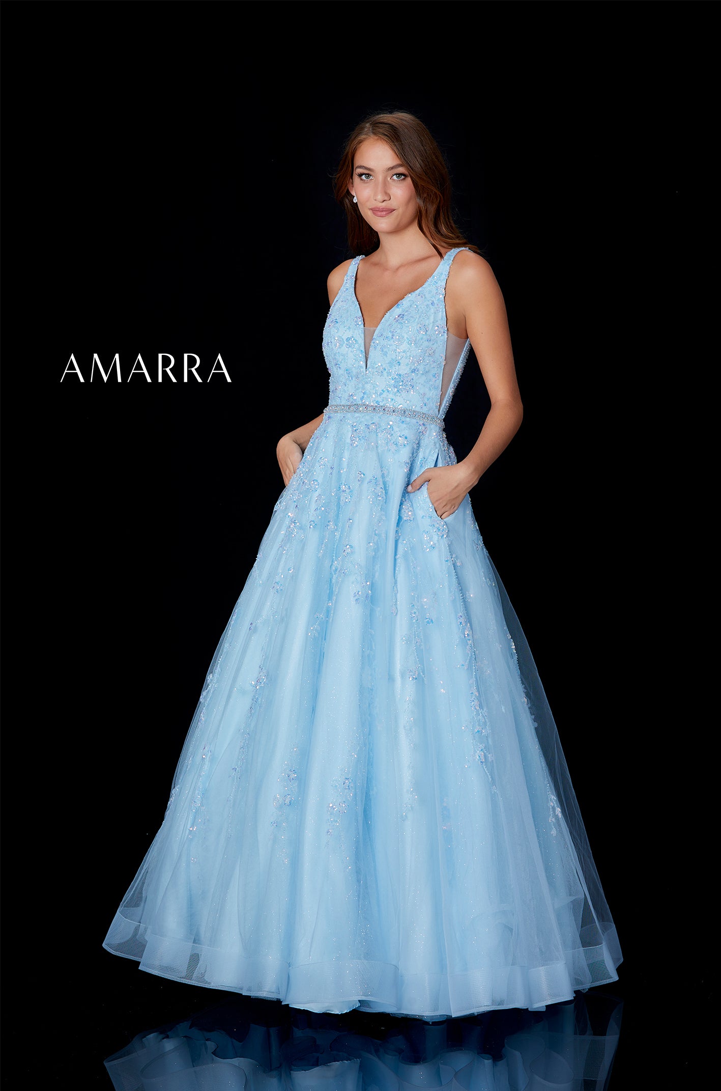 Description: A modern princess daydream. AMARRA 87236 is an elegant, princess-like style that is complemented perfectly with modern, chic features. This floral sequin ball gown features a sensual v-neck with a mesh insert, providing the perfect amount of elegance to the overall look. The style is snatched at the waist with a beaded belt and sheer panel sides. The gorgeous floral sequin detail falls to the bottom of the tulle skirt and is completed with an open-back design and discrete pockets. If youre looking for a modest design with a royal-like quality, this is the ball gown youve been dreaming of.