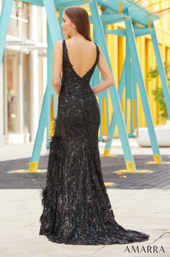 Description: Get ready to fall in love with AMARRA 88513. This lovely machine-embroidered sequin gown features a deep v-neckline and feather-embellished skirt slit, perfectly complemented by a plunging v-neckline in the back. The skirt has a slit at the front for eye-catching movement and features feathers for added drama. The lace embroidery throughout features a shimmery finish and lace embroidery for an overall elegant look. The sweep train at the back is perfect for the girl who wants to make a dramatic grand entrance. Show off your best dance moves with this gorgeous gown.