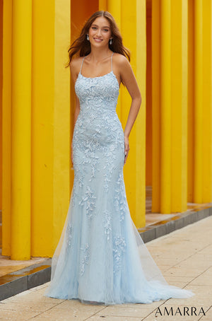 If you're looking to make unforgettable memories on prom night, look no further than the AMARRA 88550 gown. Its combination of a fitted silhouette, lace appliqued bodice, and flared tulle hem creates a captivatingly chic look that is sure to turn heads. With this stunning dress, you'll feel confident and poised as you dance the night away in style.