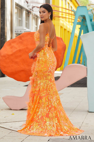 Description: Get ready to dance the night away in style with AMARRA 88553. From the moment you slip into this gorgeous, feather-embellished gown, you’ll feel like a dream come true. The lace-up back and scoop neckline bodice make for an elegant silhouette, while the fluttering skirt is sure to steal the spotlight. Fitted at the bodice, and flaring out at the hem, this dress hugs your feminine curves and legs with a feather-embellished skirt slit. Show up in this stunning gown for the prom and finish your look with a cocktail ring, statement earrings, and a necklace to match.