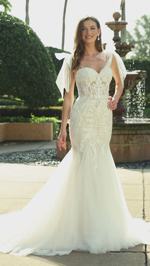 There’s nothing like a wedding dress that has a unique design and draws the eye. That’s what Angie does. This gown features dainty spaghetti straps that are topped off with stylish bows on each side. The sweetheart neckline provides plenty of support and accentuates the bust. The intricate lace design throughout the bodice creates a unique look that we haven’t seen on any other dress. Look and feel like a princess, and show off your unique style with this daring beauty. You are sure to leave everyone staring in awe at how stunning you’ll look in this extraordinary gown.