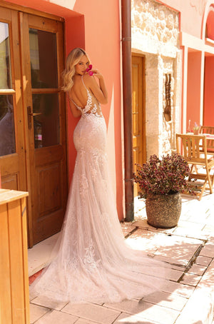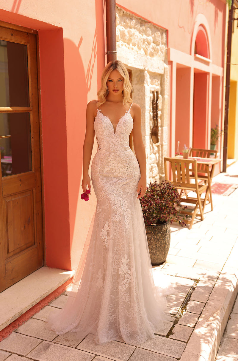 Going for an elegant look on your big day. Meet Fiona, the wedding gown that’s sure to have you feeling like the most confident you. Featuring a highly detailed lace pattern throughout and a deep-v neckline, this dress will have you walking down the aisle in style. The sheer mesh panel surrounding the waist, and wrapping around the back, creates allure, giving the dress a feeling of mystery and mystique. The back creates a V-shape and features the same lace design, which brings the look together and adds balance. The beautiful tulle skirt falls gracefully into a delicate sweep train that’s sure to have you looking and feeling elegant and classy on your big day.