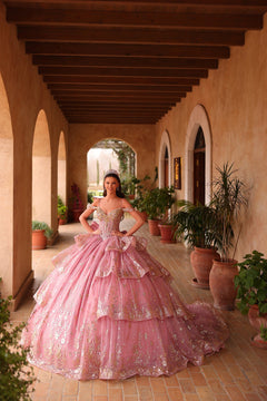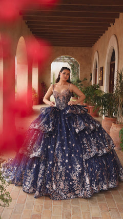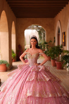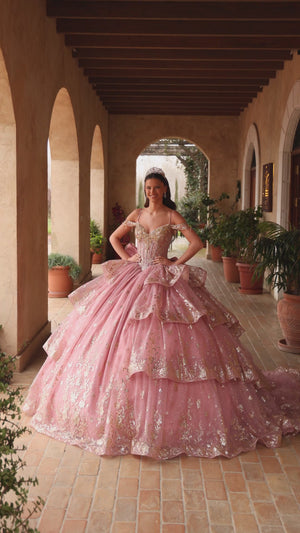 Shine like royalty in the AMARRA 54113 quinceañera dress, a stunning gown designed to grab everyones attention. This style features a corset-style bodice richly adorned with metallic floral applique and sequins, paired with delicate off-the-shoulder straps. The voluminous skirt showcases layered tulle ruffles with gold glitter floral detailing, creating depth and movement. Finished with a lace-up back and sweeping train, this gown blends drama and sophistication for your special day.
