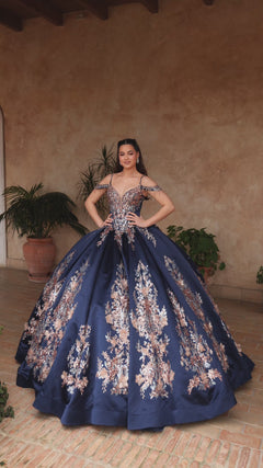 Turn heads in the AMARRA 54127 quinceañera gown, blending tradition with bold sophistication. A beaded bodice with shoulder cutouts and spaghetti straps sparkles against the rich satin fabric. Floral embroidery climbs the full ballgown skirt, while a lace-up back adds structure and elegance.