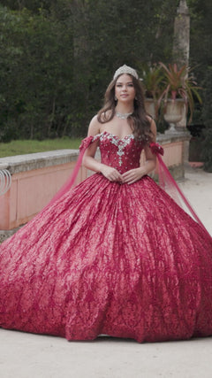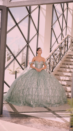 Step into enchantment with our beautiful quinceanera gown! Made of luxurious glitter tulle fabric with intricate lace and embroidered patterns, this dress boasts a strapless sweetheart neckline, short sleeves, detachable off-the-shoulder straps, and a cinched waistline for a dreamy silhouette. Perfect for fairytales and fantasies, it's a must-have for your special occasion. Get ready to dazzle!