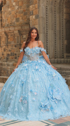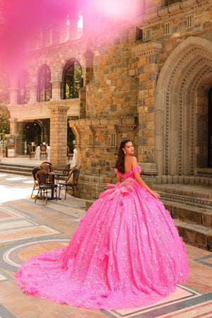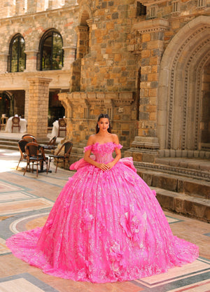 This stunning gown features a sweetheart neckline adorned with floral accents and delicate off-the-shoulder straps. The bodice is designed with a sheer corset-style structure outlined with hot-fix shoe stones, creating a dazzling visual effect. Lavishly decorated with beading, a patterned glitter net with three-dimensional flowers, and shimmering details, it exudes a magical, ethereal appearance. These embellishments are concentrated heavily on the upper part of the dress and gradually spread down the full, airy skirt, producing a captivating flowing pattern. The ball gown silhouette is dramatically full, with layers of glitter tulle that billow out in a princess-like fashion. A large bow at the back enhances the gown's romantic allure and theatrical flair. The skirt extends into a flowing train, emphasizing the grandeur of the dress. This gown embodies a fairytale aesthetic, perfect for a truly unforgettable quinceañera celebration.
