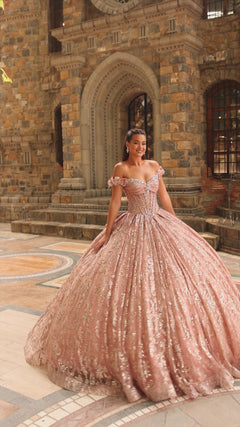 This stunning dress features a sweetheart neckline with off-the-shoulder straps adorned with beaded floral appliqués. The corset-style bodice is decorated with intricate beadwork and stone accents, while hot-fix shoe stones outline the structure, creating a dazzling, jewel-encrusted effect. The voluminous ball gown skirt is made of multiple layers of glitter tulle, embellished with a shimmering glitter pattern and a patterned glitter net with three-dimensional flowers, creating an ethereal, twinkling effect. A standout feature is the large bow detail at the back of the waist, adding an extra touch of drama and elegance. The swirling glitter pattern covering the gown catches the light, giving it a magical, fairytale quality, perfect for a quinceañera celebration.