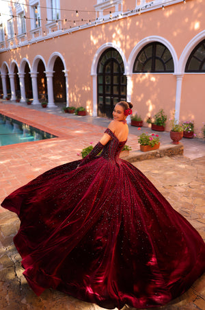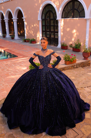 Description: Introducing a riveting quinceañera ball gown featuring a stunning glittery tulle and an elegant basque waistline. The tulle skirt is characterized by a flowy fabric accentuated with beautiful gathers. The corset bodice boasts a delightful sweetheart neckline, while the ensemble is elevated by captivating kimono sleeves, evoking an everlasting allure. With its shimmering embellishments, the gown captures the essence of a star-studded night sky, casting a spellbinding aura. This dress blends timeless charm with a touch of elegance, making it a captivating choice for a quinceañera celebration. And to top it all, it comes with a beautiful matching necklace. This creation is the epitome of value; numerous incredible components at one unbeatable price!