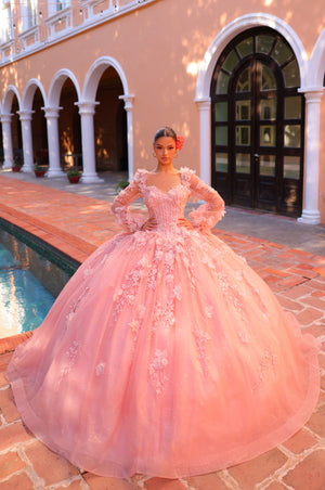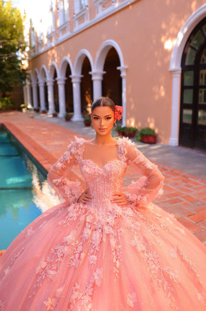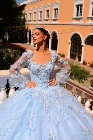 Description: Experience a floral fantasy with this exquisite quinceañera ball gown. Embroidered lace and intricate three-dimensional flower accents adorn every inch of this dazzling dress. The bell sleeve design adds an air of elegance and sophistication to this stunning ensemble. The lace exudes a radiant shimmer, elevating the overall appearance and capturing attention from every angle. As for the semi-sweetheart neckline, we couldn’t choose a better design to boost your confidence in this incredible creation. Prepare to make a grand entrance and leave a lasting impression with this tantalizing quinceañera gown. A true jaw-dropper!