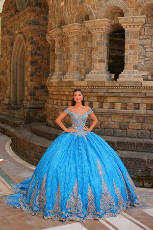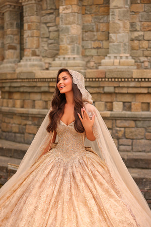 Quinceanera Dress with Embroidered Lace, Stone Accents and Matching Cape. This exquisite quinceañera dress is adorned with captivating three-dimensional embellishments, featuring intricate beading and delicate stone accents. The dress boasts a timeless sweetheart neckline and a strapless design, exuding a regal and princess-like aura. Adding to its allure, a magnificent hooded cape, which can be detached, gracefully drapes over the gown, creating an enchanting effect. This ensemble epitomizes elegance and sophistication, making it the perfect choice for a quinceañera celebration.