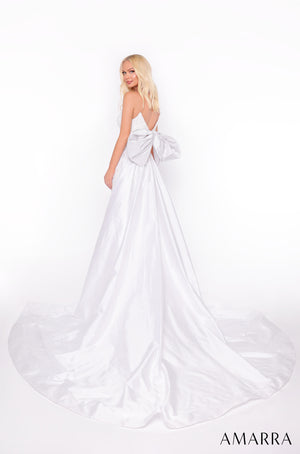 Crafted to perfection, this gown boasts a fitted silhouette that gracefully transitions into a mesmerizing mermaid style at the hem. Adorned with intricate lace, it exudes timeless allure. The sleeveless design, accentuated by a plunging neckline, adds a touch of allure. Completing the ensemble is a stunning bow train that elegantly trails behind, ensuring you make a captivating entrance at any event.