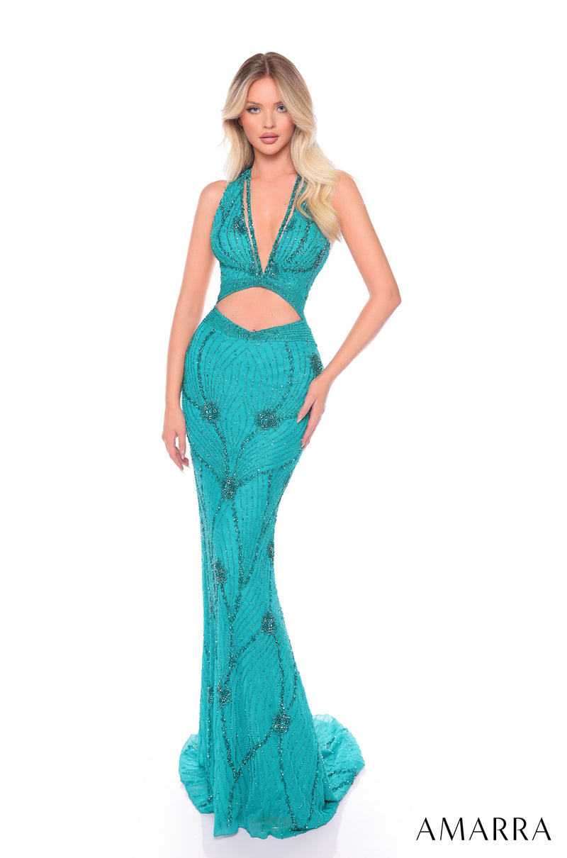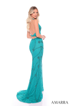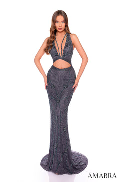 Crafted with a mermaid silhouette, this dress gracefully hugs the figure from the bodice down to the knees before flowing into a lavish, full skirt that cascades to the floor. It features a daring plunging neckline, delicately beaded straps that transition into a chic halter neck, a sexy open back, and a tasteful cut-out detail at the midriff, offering a hint of allure. Sparkling accents, resembling glittering stars, dance amidst the beadwork, casting a luminous glow with every movement. Covered in a whisper-soft mesh, the fabric is adorned with lined patterns, weaving abstract swirls and curves that enhance the gown's enchanting aesthetic.