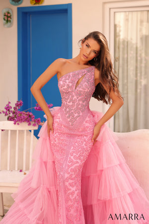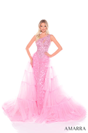 This enchanting ball gown is a true showstopper, perfect for making a grand entrance at any formal event. The dress features a stunning one-shoulder design with an asymmetrical neckline, adding a modern twist to the classic silhouette. The fitted bodice and skirt are adorned with intricate beaded embellishments that shimmer and catch the light with every movement. The real drama unfolds at the back, where a voluminous ruffled tulle overskirt cascades to the floor, creating a romantic and ethereal effect. This detachable overskirt transforms the gown from a sleek, form-fitting dress to a breathtaking ball gown, offering two looks in one. The floor-length design ensures a graceful sweep as you move, while the hidden back zipper provides a seamless closure. This gown in a delightful candy pink hue is ideal for proms, galas, or any black-tie affair where you want to make a lasting impression with its combination of sparkle, softness, and sophisticated design.