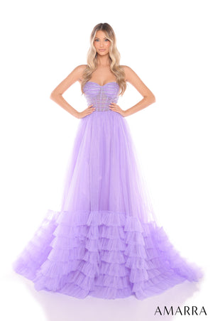 This enchanting ball gown is the epitome of romantic elegance. The strapless design features a sweetheart neckline and a sheer corset bodice adorned with sparkling beads, creating a dazzling effect. The voluminous tulle skirt cascades to the floor in dreamy layers, with delicate ruffles adding texture and movement to the lower portion of the gown. The lace-up back ensures a perfect fit while adding a touch of classic charm. The combination of the ethereal tulle, the shimmering bodice, and the flowing silhouette creates a dress that is both timeless and unforgettable, promising to make you feel like a true princess.