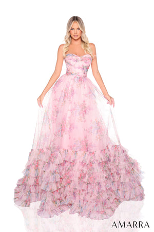 This enchanting floor-length ball gown is a vision of romantic whimsy in soft pink tulle adorned with a delicate floral print. The strapless bodice features a flattering semi-sweetheart neckline and is beautifully pleated, offering structure and elegance to the bodice. The gown's silhouette expands dramatically from the waist into a voluminous skirt, embodying the classic ball gown shape. The standout feature of this dress is the cascading layers of ruffled tulle that adorn the lower half of the skirt, creating a dreamy, cloud-like effect that adds movement and texture. It also has a lace-up back that ensures a perfect, adjustable fit. The overall floral print in soft pinks and hints of blue gives the gown a fresh, spring-like feel. The mix of structured bodice and flowing, ruffled skirt creates a balanced and captivating silhouette that's sure to make a lasting impression.