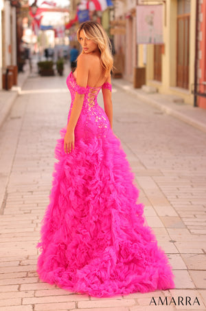 This stunning floor-length gown features a fitted silhouette that hugs the body's curves before cascading into a dramatic ruffled tulle skirt. The bodice is intricately designed with a plunging neckline and a corset-style structure, adorned with sparkling sequin embellishments and delicate floral embroidery that adds depth and texture. Elegant off-the-shoulder sleeves frame the bust, lending a romantic touch to the ensemble. A daring high slit in the skirt reveals a glimpse of the leg and allows for ease of movement. The skirt is a masterpiece of layered tulle ruffles, creating a voluminous and ethereal effect that flows gracefully to the floor. The back of the dress features a lace-up closure, ensuring a perfect, adjustable fit. This gown beautifully balances glamour and whimsy, making it an ideal choice for grand galas, proms, or any event where making a bold, feminine statement is desired.
