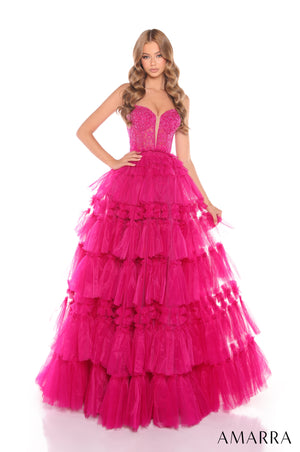 This enchanting ruffle tulle ball gown is designed to captivate with its voluminous layered skirt and intricate details. The sleeveless dress features a plunging neckline, highlighting a sheer corset bodice adorned with delicate beaded embellishments for an added touch of glamour. The dramatic floor-length skirt is composed of cascading ruffles, creating a regal and romantic silhouette. Completing the look is a lace-up back, allowing for a secure and customizable fit. Perfect for making a grand entrance on any formal occasion, this gown exudes elegance and charm.