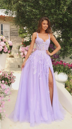 Description: Exude glamor in this mesmerizing gown made from glitter tulle and adorned with exquisite embroidered lace. The dress has a flattering sheer boned corset and underwired bra cups that enhance your natural curves. The low V-back adds a touch of allure and drama, making a stunning statement on the dance floor. With its A-line silhouette and Sweep train, this dress is the epitome of timeless beauty and will make you feel like a true prom queen.