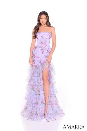 Sweet and whimsical, this strapless floral gown features a fitted bodice, thigh‑high slit, and cascading tiered ruffle skirt for movement and flair.