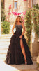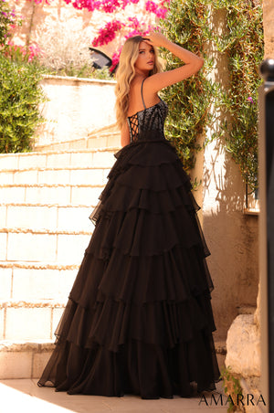 Command attention in the AMARRA 89459 gown, featuring a tiered ruffle skirt and structured corset bodice. The fitted top balances the voluminous skirt, while the slit adds modern flair. A bold evening statement.