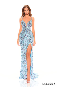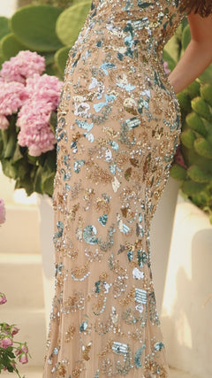 Description: For the modern woman, feast your eyes on this elegant dress made from satin and complemented by sequin appliques that are stunningly embroidered on the gown. Held by delicate thin spaghetti straps, the deep plunging illusion V-neck creates a mesmerizing focal point while adding a seductive touch to the striking ensemble. The dress flows majestically into a fit and flare silhouette which trails off at the back in a sweep train. The thigh-high slit and mid-scoop bare back bring out a sensual allure as you capture and command the room.