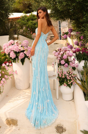 Description: Delicately adorned with intricate sequin embroidery, glistening beading, and tulle, this ensemble is a stroke of genius. The graceful one-shoulder design adds a modern twist to the traditional silhouette. With its fit and flare silhouette, the dress dances along your curves creating a perfect hourglass figure. The straight across neckline held by spaghetti straps also adds a captivating and unique look while the slit adds allure to the design. With this beauty, you’re sure to be the star anywhere you set your feet.