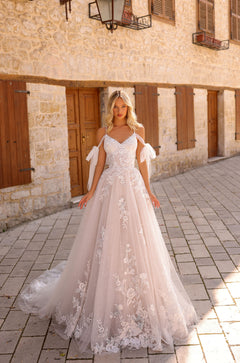 Chloe is fit for a queen. This exquisite A-line masterpiece is designed to make you shine when you walk down the aisle. As you put it on, you will be captivated by the delicate off-the-shoulder tie-ons that gently drape along your arms. These adjustable details make it very easy for you to move and stretch your arms. The lavish fabric cascades gracefully down the sides, adding a touch of enchantment to the dress’s overall design. The flowy skirt embraces your every movement so that you can glide across the floor with ease. It’s perfect for a bride that wants to feel comfortable and unrestricted for her big day.